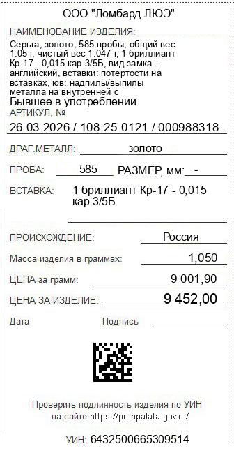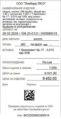 Цена за грамм общего веса: 9001.9Цена за грамм чистого веса: 9027.7Организация: ООО "Ломбард ЛЮЭ"Металл: золотоПроба: 585Артикул: 26.03.2026 / 108-25-0121 / 000988318Базовая единица: шт