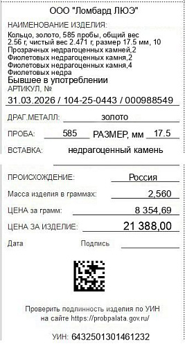 УИН: 6432501301461232Описание вставок: 10 Прозрачных недрагоценных камней,2 Фиолетовых недрагоценных камня,2 Фиолетовых недрагоценных камня,4 Фиолетовых недрагоценных камняОбщий вес: 2.56Чистый вес: 2.471Вес вставок: 0.089Высота, мм: 11Высота шинки, мм: 1.9