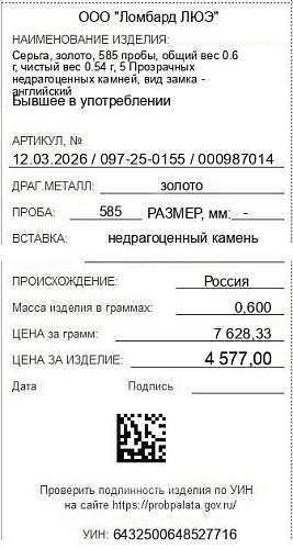 Цена за грамм общего веса: 7628.33Цена за грамм чистого веса: 8475.93Организация: ООО "Ломбард ЛЮЭ"Металл: золотоПроба: 585Артикул: 12.03.2026 / 097-25-0155 / 000987014Базовая единица: шт