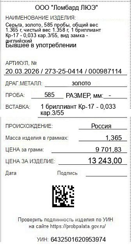 Цена за грамм общего веса: 9701.83Цена за грамм чистого веса: 9751.84Организация: ООО "Ломбард ЛЮЭ"Металл: золотоПроба: 585Артикул: 20.03.2026 / 273-25-0414 / 000987114Базовая единица: шт