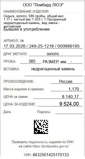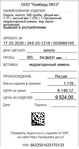 Цена за грамм общего веса: 8140.17Цена за грамм чистого веса: 9219.75Организация: ООО "Ломбард ЛЮЭ"Металл: золотоПроба: 585Артикул: 17.03.2026 / 249-25-1218 / 000986195Базовая единица: шт