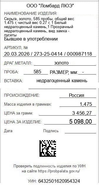 Цена за грамм общего веса: 3456.27Цена за грамм чистого веса: 18881.48Организация: ООО "Ломбард ЛЮЭ"Металл: золотоПроба: 585Артикул: 20.03.2026 / 273-25-0414 / 000987118Базовая единица: шт