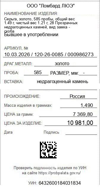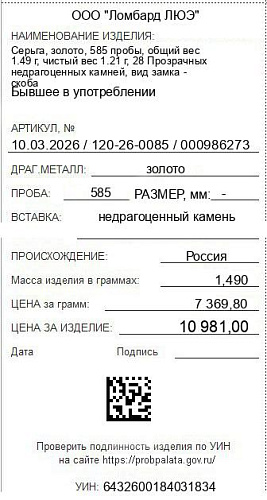 Цена за грамм общего веса: 7369.8Цена за грамм чистого веса: 9075.21Организация: ООО "Ломбард ЛЮЭ"Металл: золотоПроба: 585Артикул: 10.03.2026 / 120-26-0085 / 000986273Базовая единица: шт