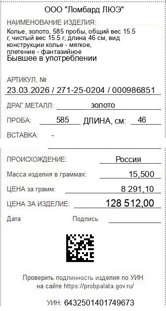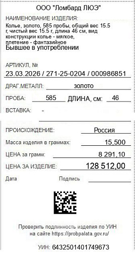 Цена за грамм общего веса: 8291.1Цена за грамм чистого веса: 8291.1Организация: ООО "Ломбард ЛЮЭ"Металл: золотоПроба: 585Артикул: 23.03.2026 / 271-25-0204 / 000986851Базовая единица: шт