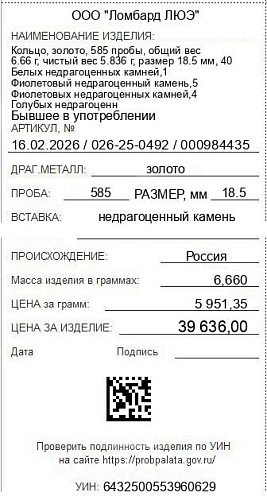 Цена за грамм общего веса: 5951.35Цена за грамм чистого веса: 6791.64Организация: ООО "Ломбард ЛЮЭ"Металл: золотоПроба: 585Артикул: 16.02.2026 / 026-25-0492 / 000984435Базовая единица: шт