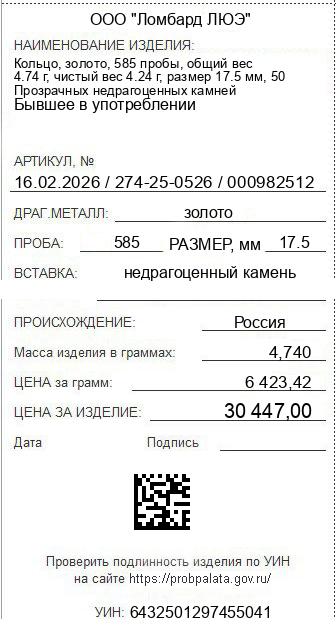 Цена за грамм общего веса: 6423.42Цена за грамм чистого веса: 7180.9Организация: ООО "Ломбард ЛЮЭ"Металл: золотоПроба: 585Артикул: 16.02.2026 / 274-25-0526 / 000982512Базовая единица: шт