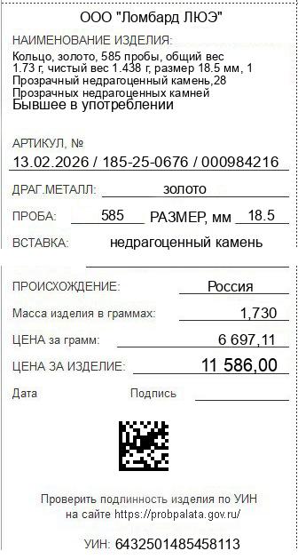 Цена за грамм общего веса: 6697.11Цена за грамм чистого веса: 8057.02Организация: ООО "Ломбард ЛЮЭ"Металл: золотоПроба: 585Артикул: 13.02.2026 / 185-25-0676 / 000984216Базовая единица: шт