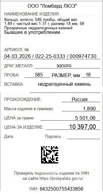Цена за грамм общего веса: 5501.06Цена за грамм чистого веса: 7936.64Организация: ООО "Ломбард ЛЮЭ"Металл: золотоПроба: 585Артикул: 04.03.2026 / 022-25-0333 / 000974730Базовая единица: шт