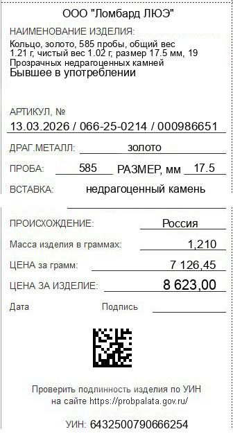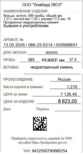 Цена за грамм общего веса: 7126.45Цена за грамм чистого веса: 8453.92Организация: ООО "Ломбард ЛЮЭ"Металл: золотоПроба: 585Артикул: 13.03.2026 / 066-25-0214 / 000986651Базовая единица: шт
