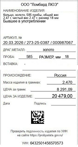 Цена за грамм общего веса: 8291.09Цена за грамм чистого веса: 8291.09Организация: ООО "Ломбард ЛЮЭ"Металл: золотоПроба: 585Артикул: 20.03.2026 / 273-25-0387 / 000987067Базовая единица: шт