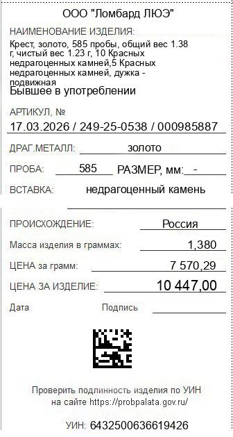 Цена за грамм общего веса: 7570.29Цена за грамм чистого веса: 8493.5Организация: ООО "Ломбард ЛЮЭ"Металл: золотоПроба: 585Артикул: 17.03.2026 / 249-25-0538 / 000985887Базовая единица: шт
