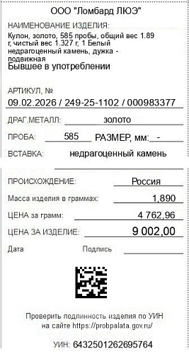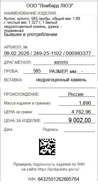 Цена за грамм общего веса: 4762.96Цена за грамм чистого веса: 6783.72Организация: ООО "Ломбард ЛЮЭ"Металл: золотоПроба: 585Артикул: 09.02.2026 / 249-25-1102 / 000983377Базовая единица: шт