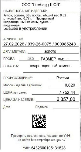 Цена за грамм общего веса: 7752.44Цена за грамм чистого веса: 8255.84Организация: ООО "Ломбард ЛЮЭ"Металл: золотоПроба: 585Артикул: 27.02.2026 / 039-26-0075 / 000985248Базовая единица: шт