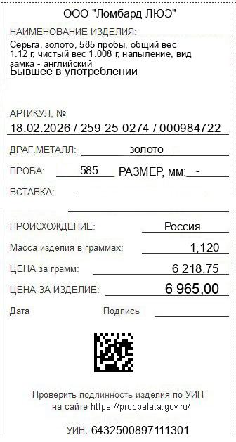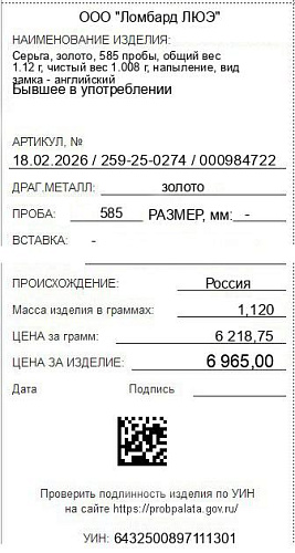 Цена за грамм общего веса: 6218.75Цена за грамм чистого веса: 6909.72Организация: ООО "Ломбард ЛЮЭ"Металл: золотоПроба: 585Артикул: 18.02.2026 / 259-25-0274 / 000984722Базовая единица: шт