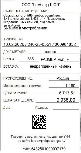 Цена за грамм общего веса: 6713.51Цена за грамм чистого веса: 6909.6Организация: ООО "Ломбард ЛЮЭ"Металл: золотоПроба: 585Артикул: 18.02.2026 / 246-25-0551 / 000984852Базовая единица: шт