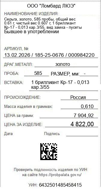 Цена за грамм общего веса: 7904.92Цена за грамм чистого веса: 7943.99Организация: ООО "Ломбард ЛЮЭ"Металл: золотоПроба: 585Артикул: 13.02.2026 / 185-25-0676 / 000984220Базовая единица: шт