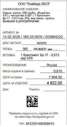 Описание: вид замка - пусетыУИН: 6432501485458415Описание вставок: 1 бриллиант Кр-17 - 0,013 кар.3/55Общий вес: 0.61Чистый вес: 0.607Вес вставок: 0.003Высота, мм: 3
