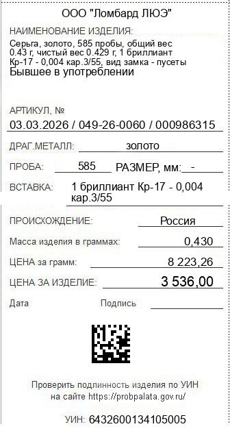 Цена за грамм общего веса: 8223.26Цена за грамм чистого веса: 8242.42Организация: ООО "Ломбард ЛЮЭ"Металл: золотоПроба: 585Артикул: 03.03.2026 / 049-26-0060 / 000986315Базовая единица: шт