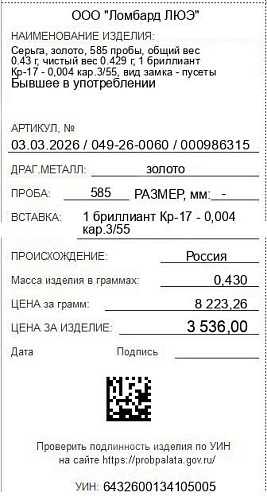 Описание: вид замка - пусетыУИН: 6432600134105005Описание вставок: 1 бриллиант Кр-17 - 0,004 кар.3/55Общий вес: 0.43Чистый вес: 0.429Вес вставок: 0.001Высота, мм: 11.05