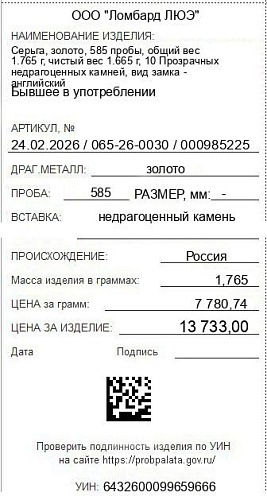 Цена за грамм общего веса: 7780.74Цена за грамм чистого веса: 8248.05Организация: ООО "Ломбард ЛЮЭ"Металл: золотоПроба: 585Артикул: 24.02.2026 / 065-26-0030 / 000985225Базовая единица: шт