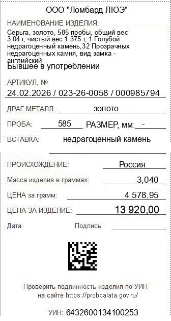 Цена за грамм общего веса: 4578.95Цена за грамм чистого веса: 10123.64Организация: ООО "Ломбард ЛЮЭ"Металл: золотоПроба: 585Артикул: 24.02.2026 / 023-26-0058 / 000985794Базовая единица: шт