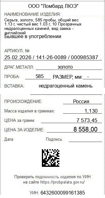 Цена за грамм общего веса: 7573.45Цена за грамм чистого веса: 8308.74Организация: ООО "Ломбард ЛЮЭ"Металл: золотоПроба: 585Артикул: 25.02.2026 / 141-26-0089 / 000985387Базовая единица: шт