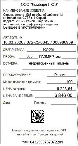 Цена за грамм общего веса: 6223.64Цена за грамм чистого веса: 9043.59Организация: ООО "Ломбард ЛЮЭ"Металл: золотоПроба: 585Артикул: 16.03.2026 / 072-25-0345 / 000986909Базовая единица: шт