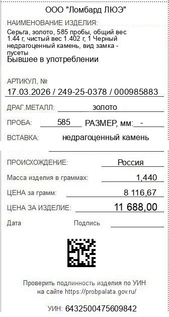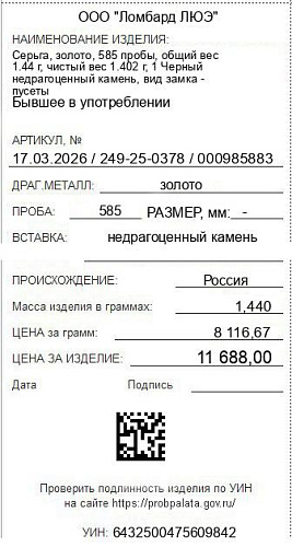 Цена за грамм общего веса: 8116.67Цена за грамм чистого веса: 8336.66Организация: ООО "Ломбард ЛЮЭ"Металл: золотоПроба: 585Артикул: 17.03.2026 / 249-25-0378 / 000985883Базовая единица: шт