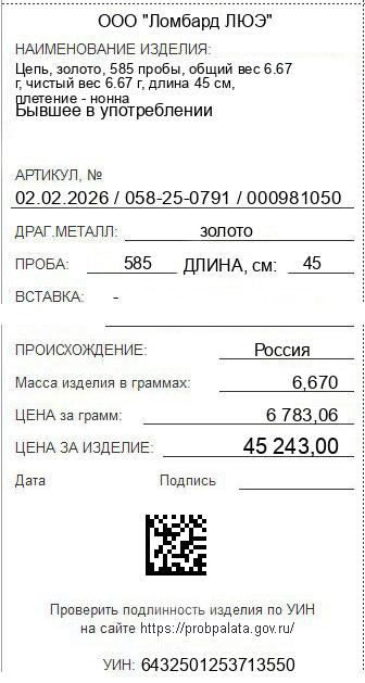 Цена за грамм общего веса: 6783.06Цена за грамм чистого веса: 6783.06Организация: ООО "Ломбард ЛЮЭ"Металл: золотоПроба: 585Артикул: 02.02.2026 / 058-25-0791 / 000981050Базовая единица: шт