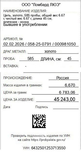 Цепь золото 585, общий вес - 6.67 г, чистый вес - 6.67 г, 45 см
